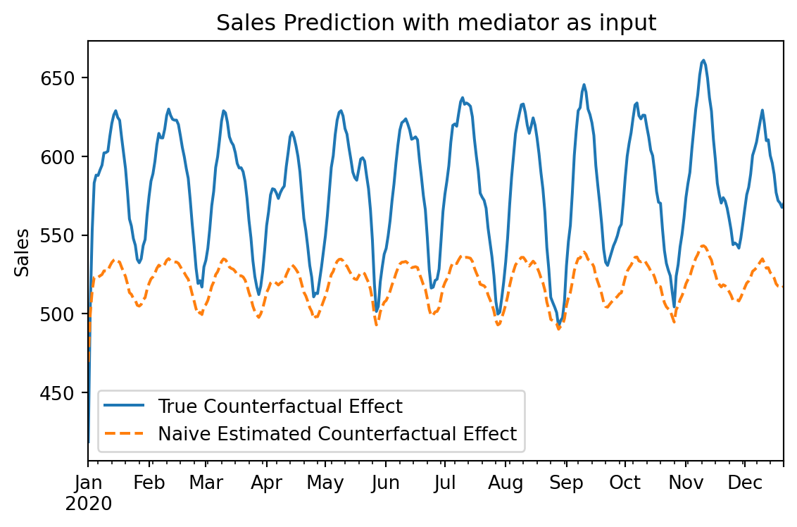 The plot above shows that the Front-door adjustment model (Green) recovers the True Counterfactual Effect (Blue) much better than the Naive model (Orange).