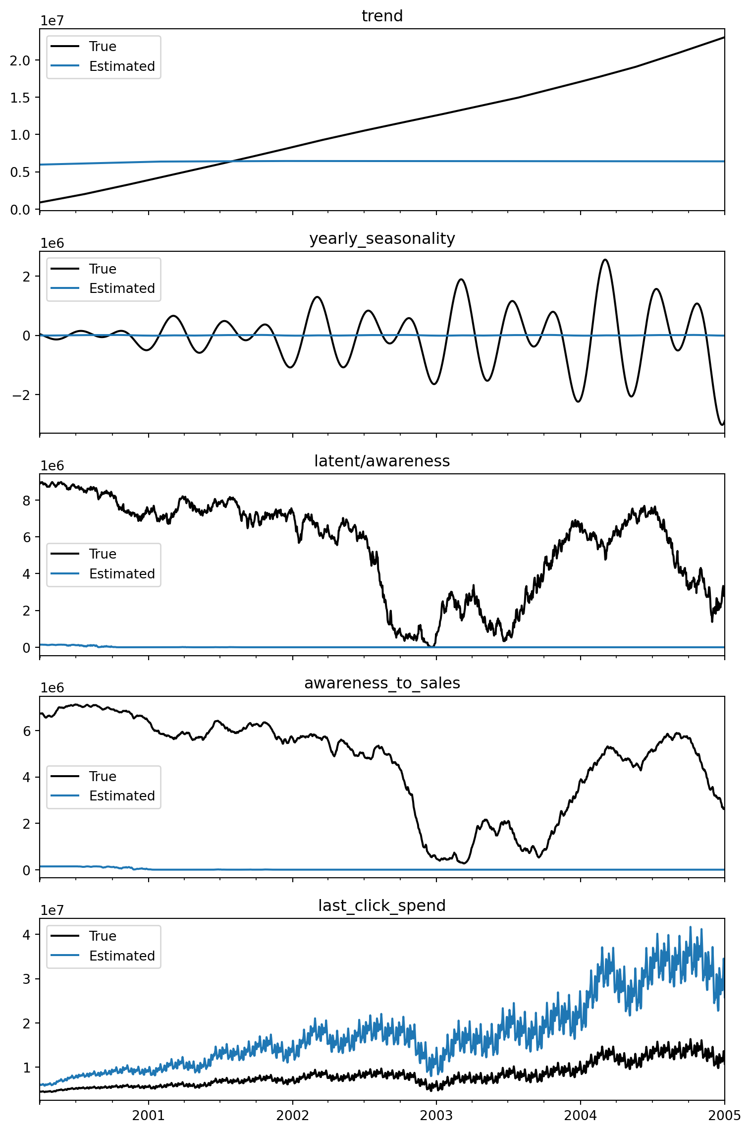 We first fit a baseline model without the proxy variable to see how it performs. Since last-click is highly correlated with sales, we will see how it overfits to last-click, leading to poor estimation of other components.