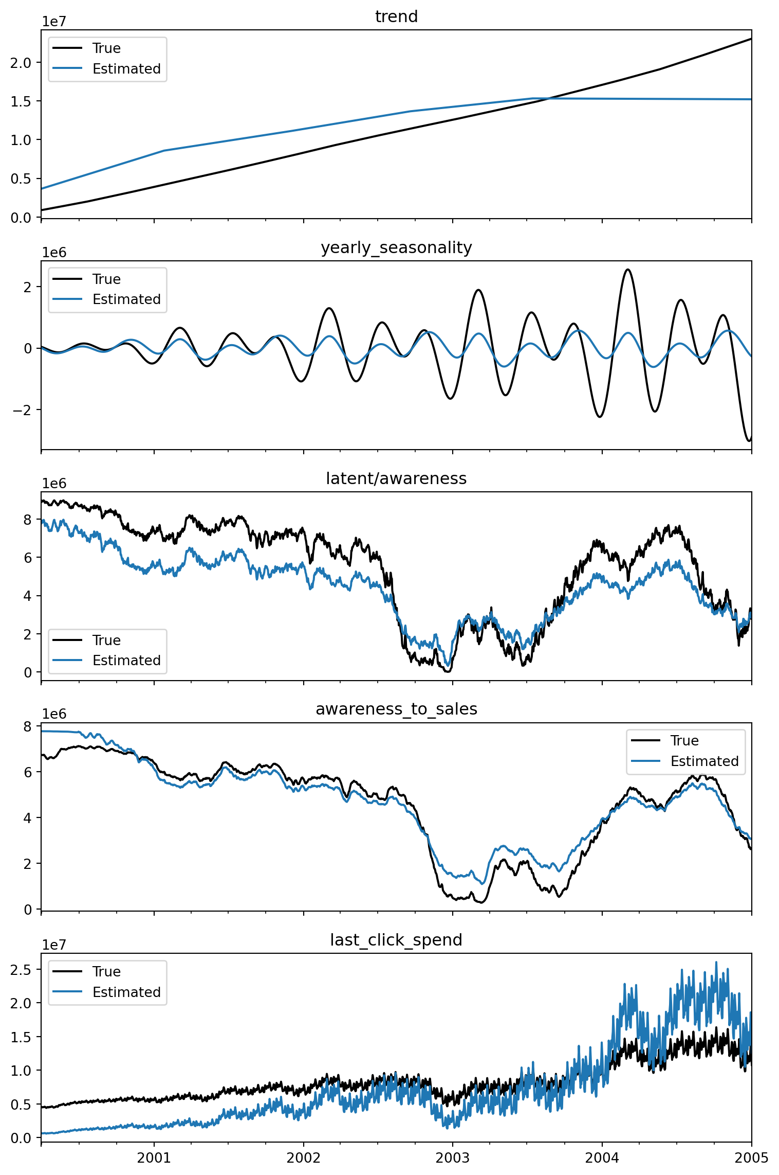 fig, axs = plt.subplots(5, 1, figsize=(8, 12), sharex=True)for i, name inenumerate( ["trend","yearly_seasonality","latent/awareness","awareness_to_sales","last_click_spend", ]): true_effect[name].plot(ax=axs[i], label="True", color="black") y_pred_components[name].plot(ax=axs[i], label="Estimated") axs[i].set_title(name) axs[i].legend()plt.tight_layout()plt.show()