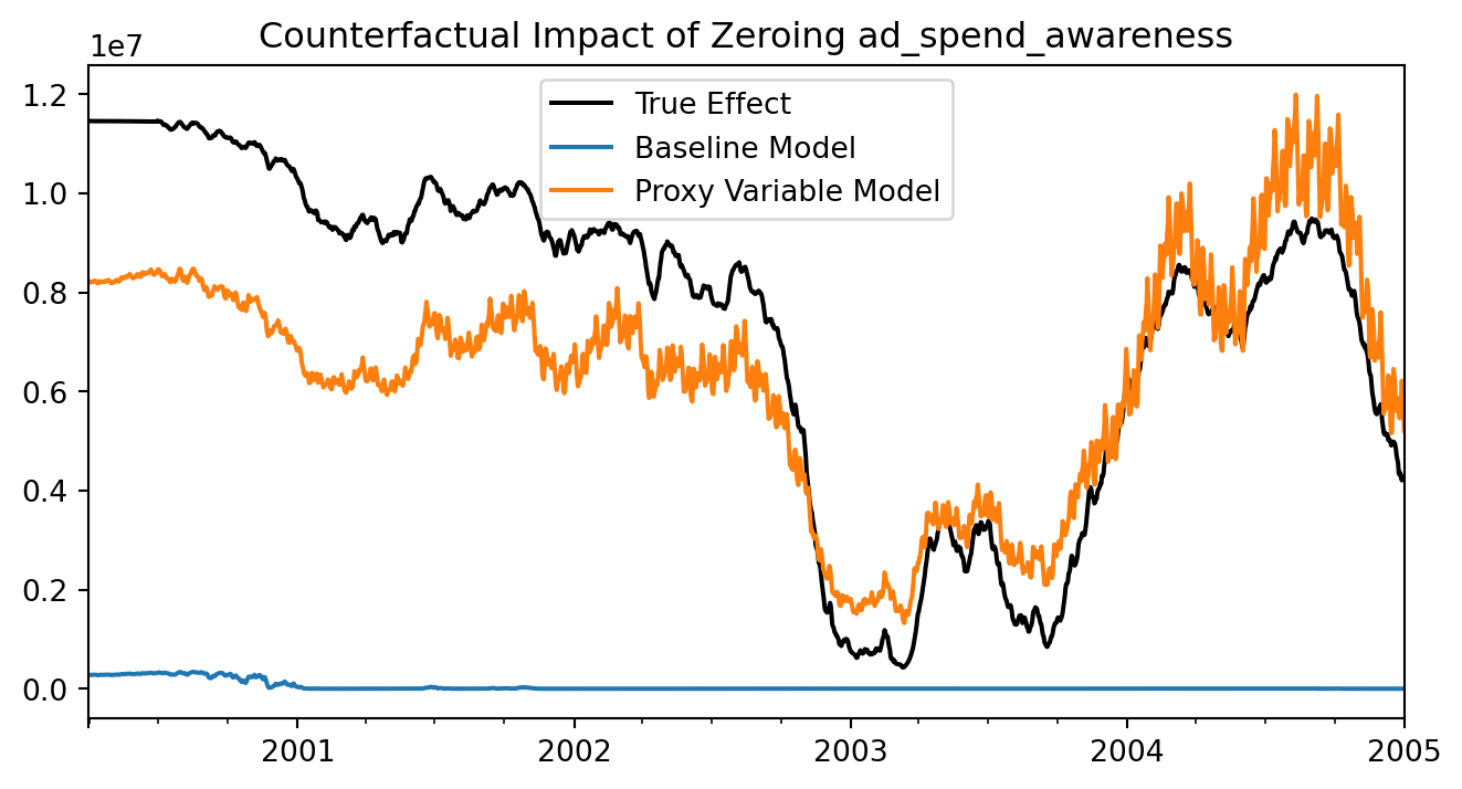 Here, we do our final comparison of the models, looking at the counterfactual impact of zeroing out the awareness ad spend. This shows how important it is to include the proxy variable to correctly attribute the impact of awareness spend.