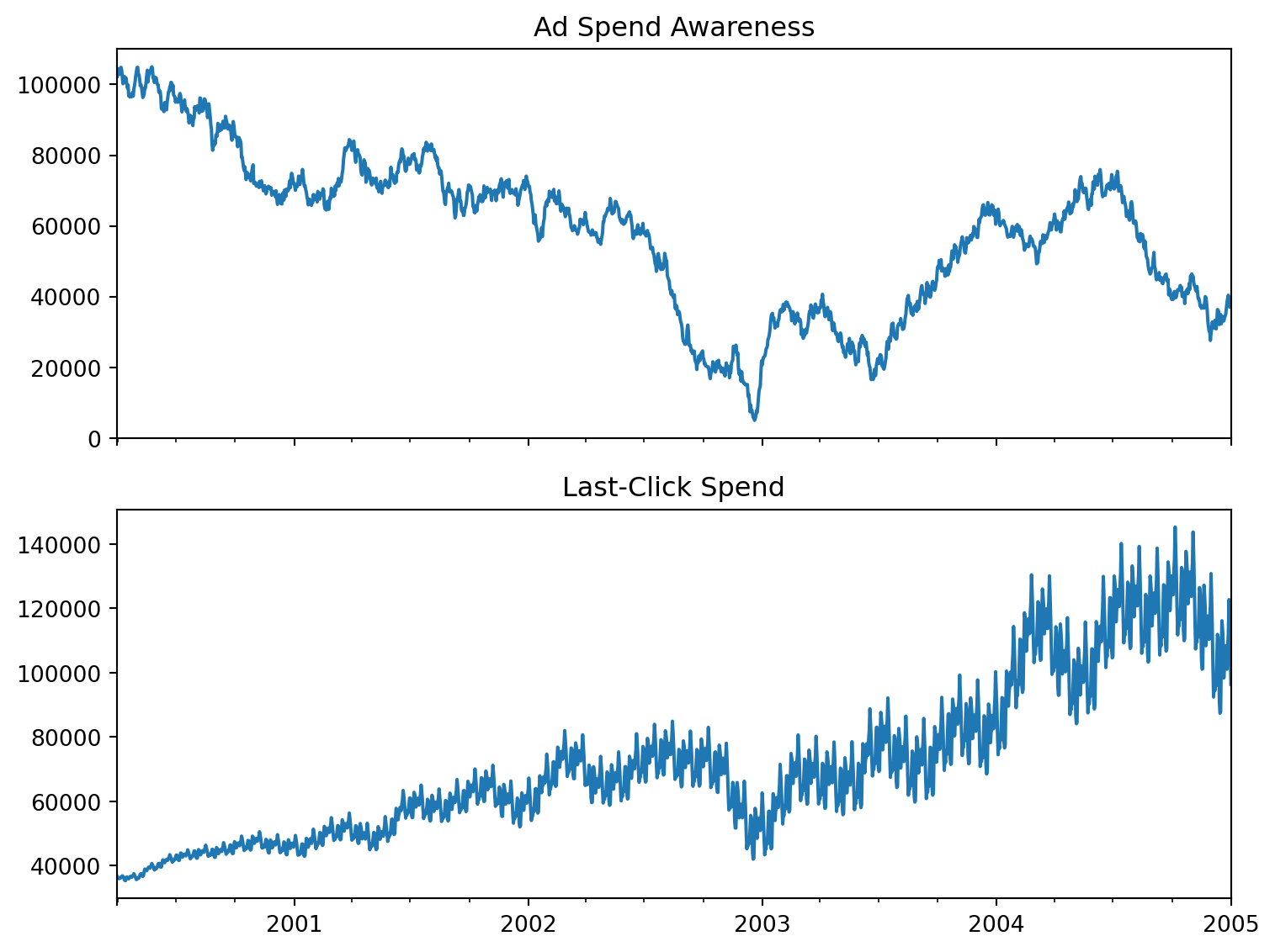 where \(\text{Baseline}(t)\) includes the latent brand awareness effect, trend, and seasonality components. We basically assume that the last-click effect is stronger when brand awareness is higher, which is a reasonable assumption in many marketing contexts.