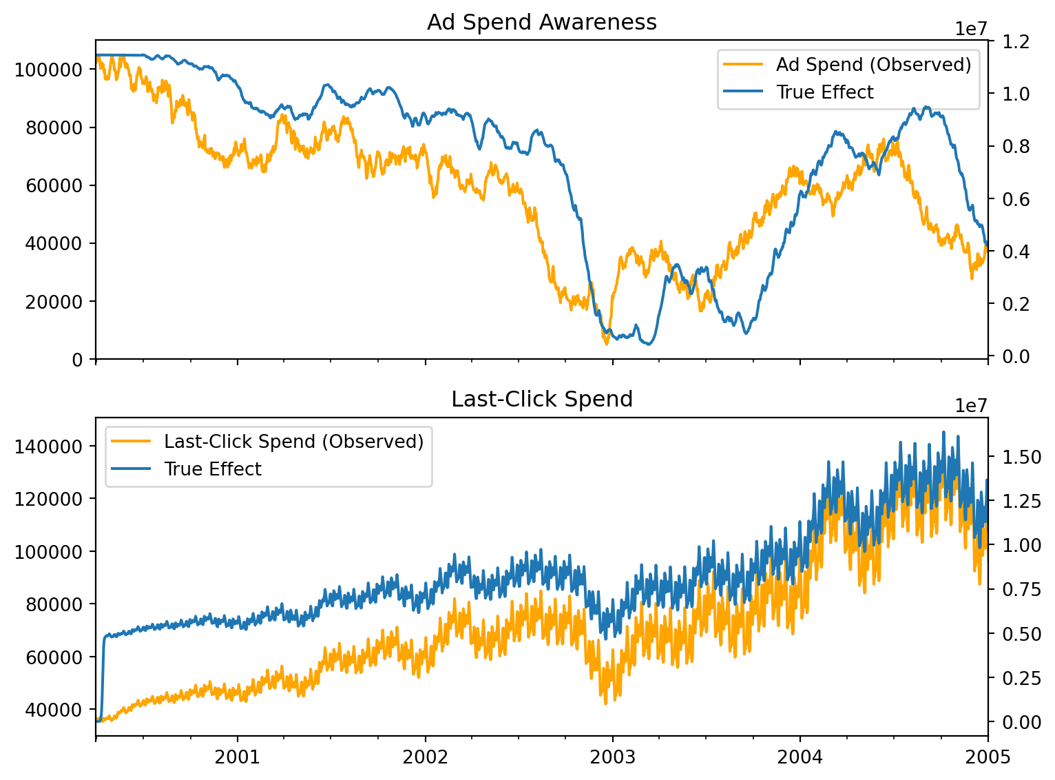 Since the last-click spend is highly correlated with sales, the model tends to over-attribute sales to the last-click effect, leading to poor estimation of other components, especially the latent awareness effect.